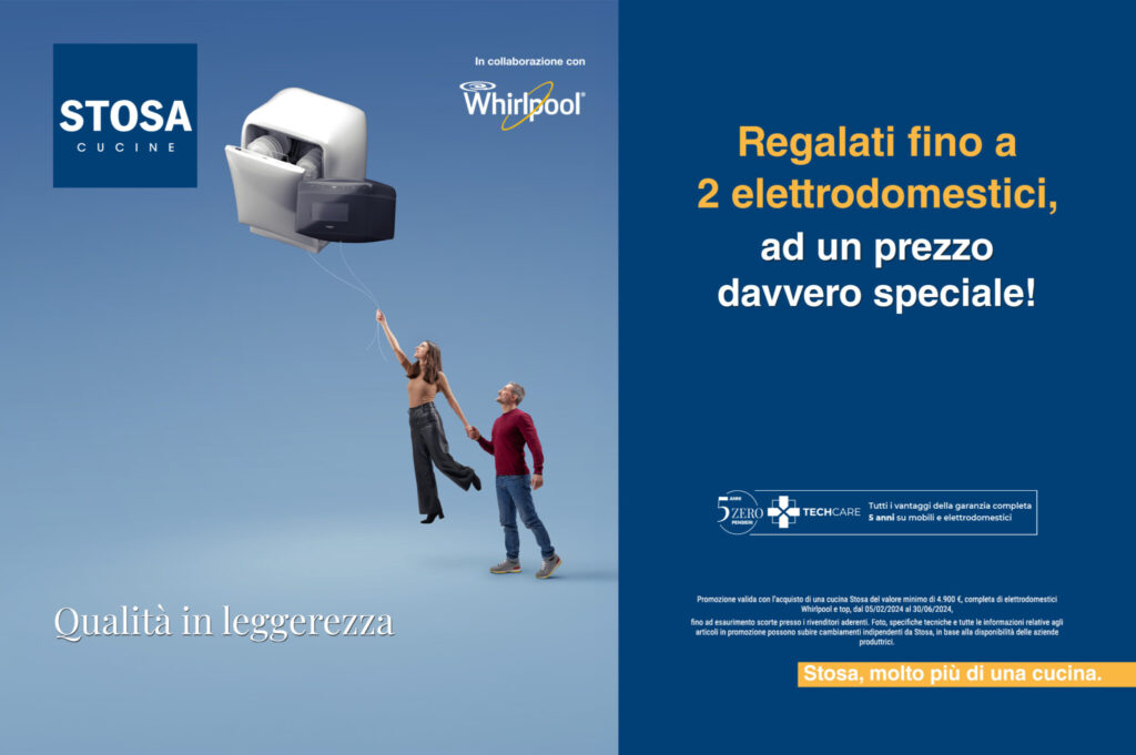 Promozione valida con l’acquisto di una cucina Stosa del valore minimo di 4.900 €, completa di elettrodomestici Whirlpool e top, fino al 30/06/2024, fino ad esaurimento scorte. Foto, specifiche tecniche e tutte le informazioni relative agli articoli in promozione possono subire cambiamenti indipendenti da Stosa, in base alla disponibilità delle aziende produttrici.
