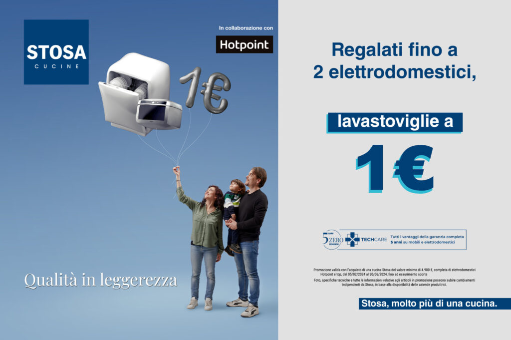 Promozione valida con l’acquisto di una cucina Stosa del valore minimo di 4.900 €, completa di elettrodomestici Hotpoint e top, fino al 30/06/2024, fino ad esaurimento scorte. Foto, specifiche tecniche e tutte le informazioni relative agli articoli in promozione possono subire cambiamenti indipendenti da Stosa, in base alla disponibilità delle aziende produttrici.